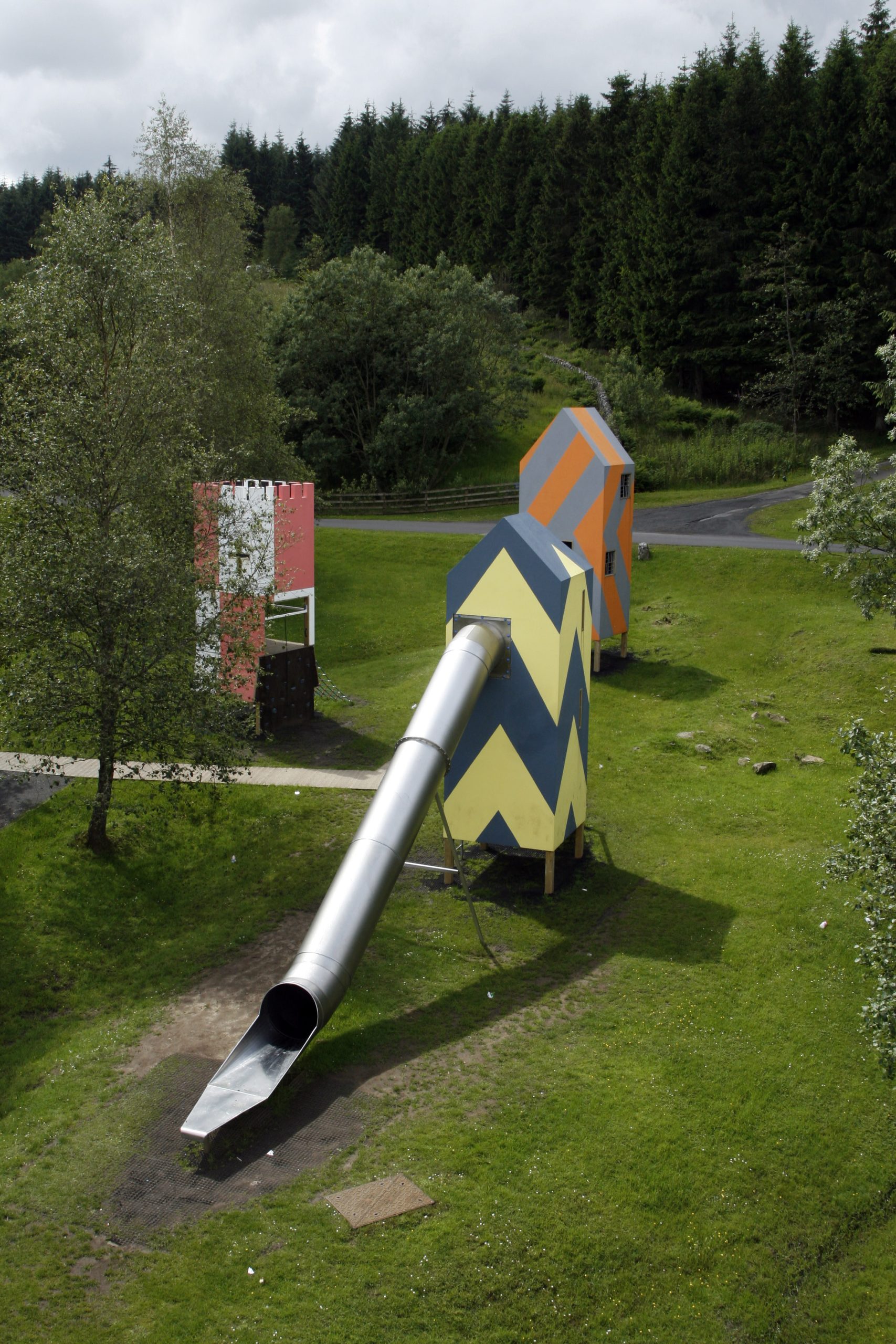 The form of the cottage, barn and castle suggests past lives of this agricultural and military landscape while a route through the play area is marked by a line of steel poles connecting the suite to the flat expanse of Kielder Water in the background.