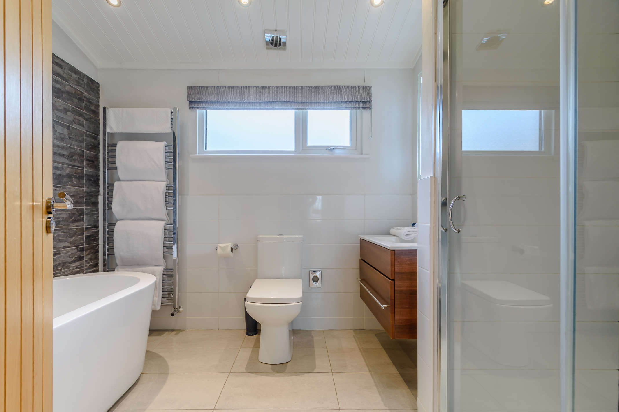 The main bathroom has a free-standing bath, separate shower and under-floor heating.